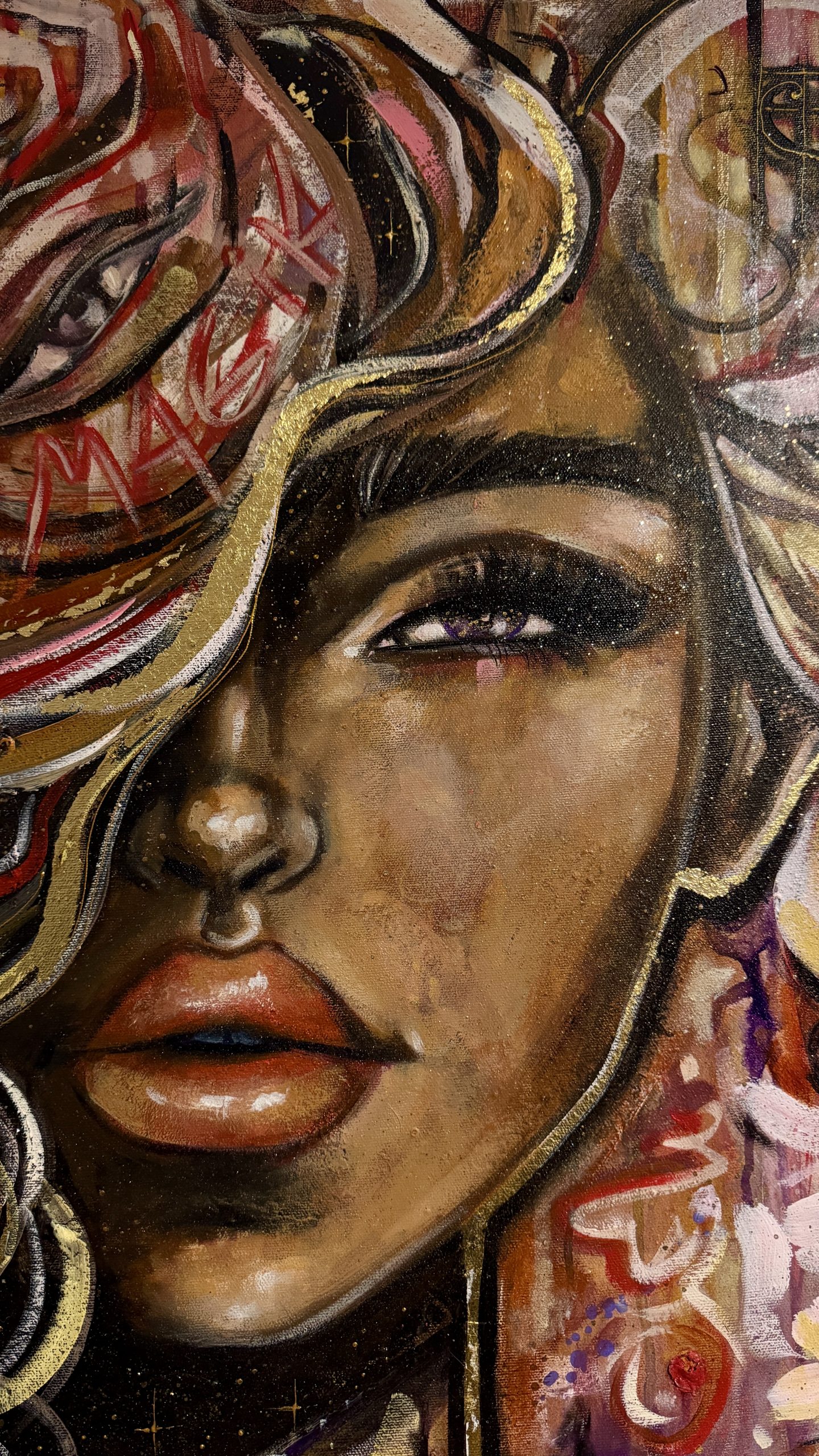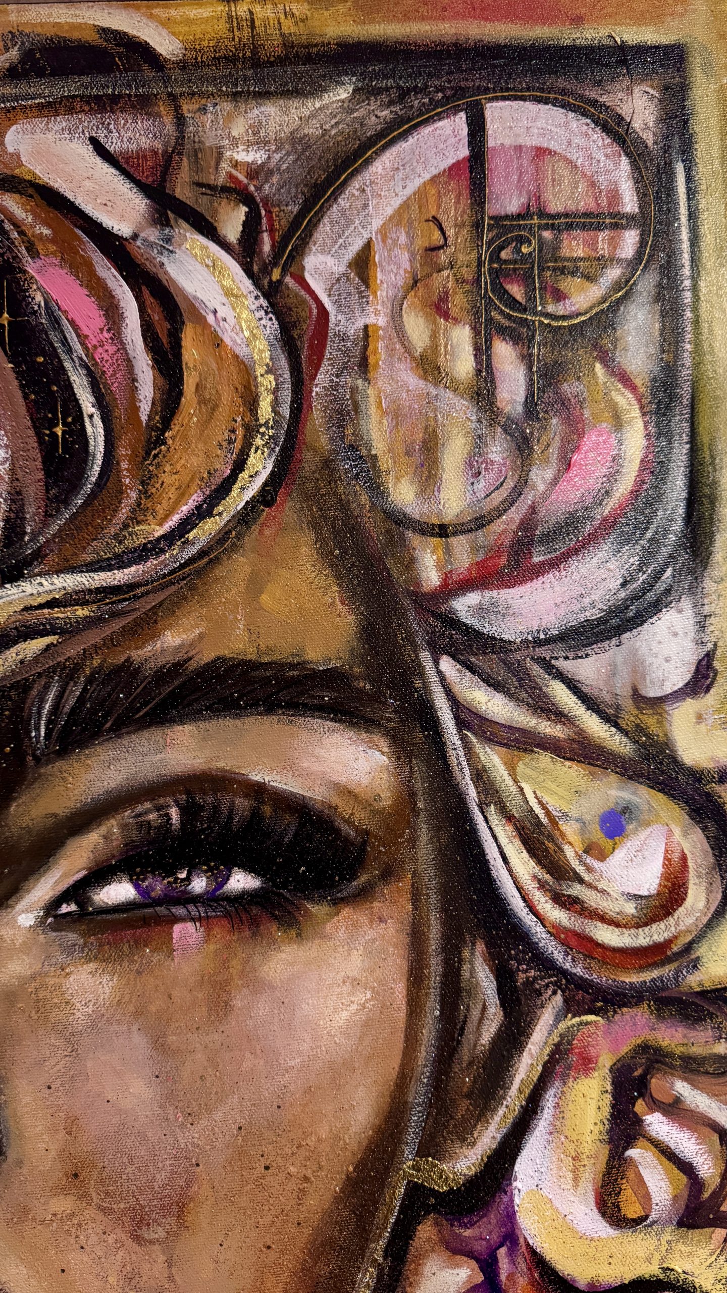 Détails : 24″x 30” peinture à l’acrylique et feuille d’or sur toile de qualité supérieure.